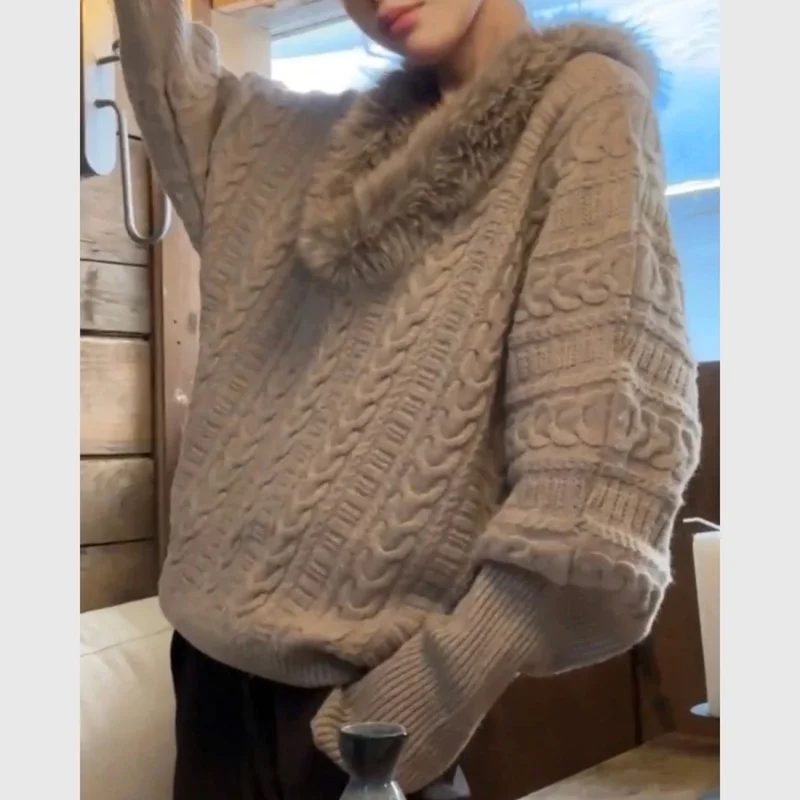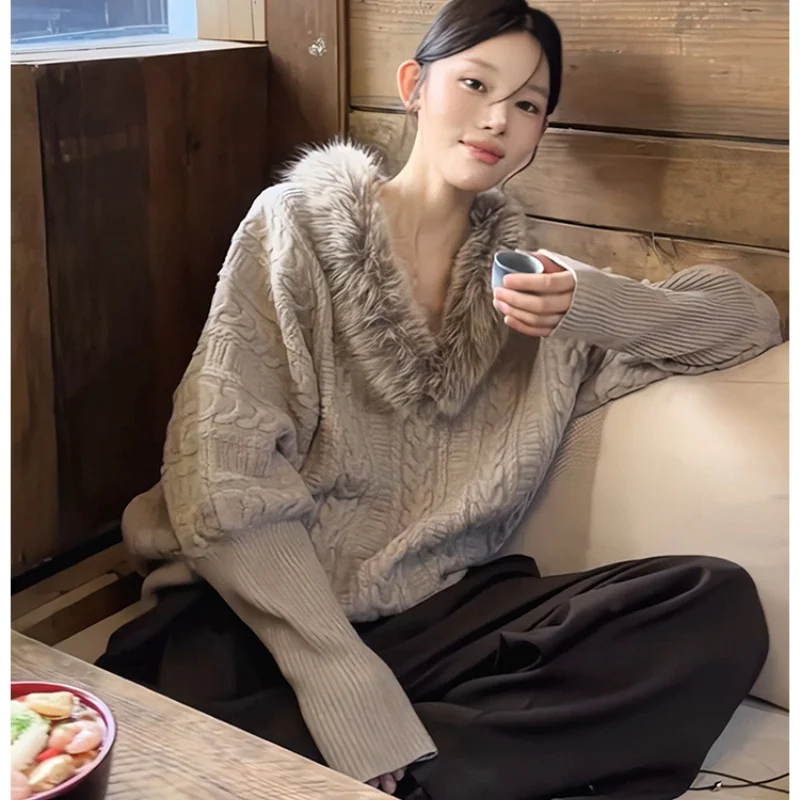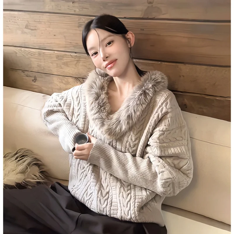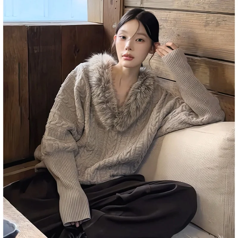 High Quality 2025 New Autumn and Winter Fashion V Neck Sweater Unique Good-looking Temperament Loose Gray Faur Fur Collar Top