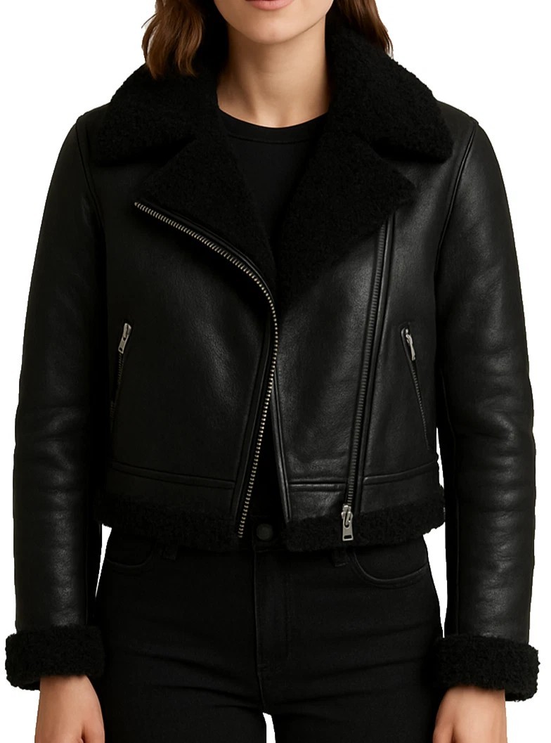 Women’s Black Cropped Shearling Biker Leather Jacket – Leather Biker Jacket