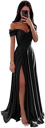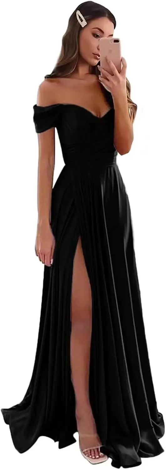 Women’s Satin Prom Dresses Long Slit Formal Dresses Off Shoulder Evening Wedding Party Gowns Ruched Sweetheart Lace up Back
