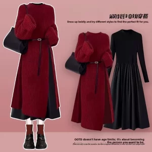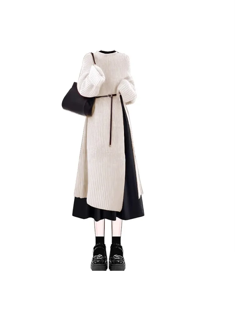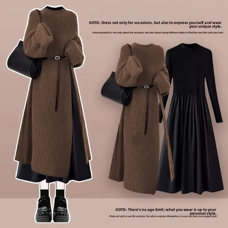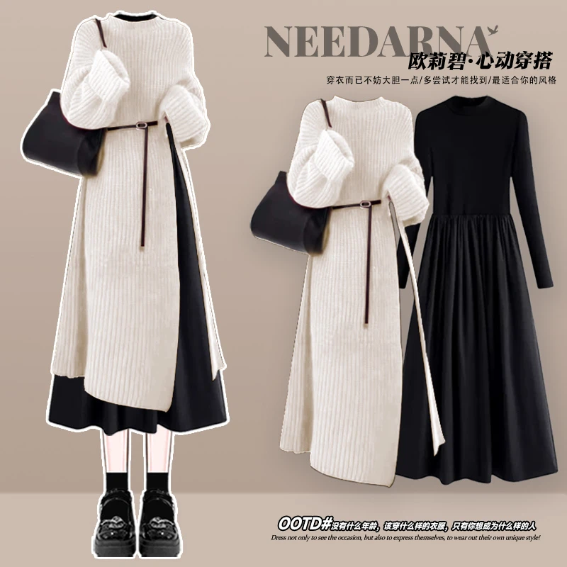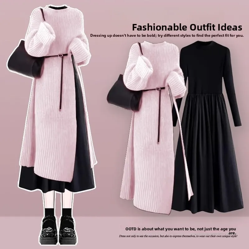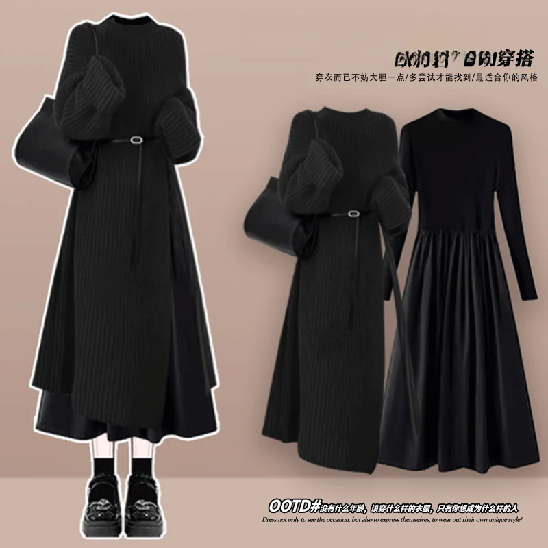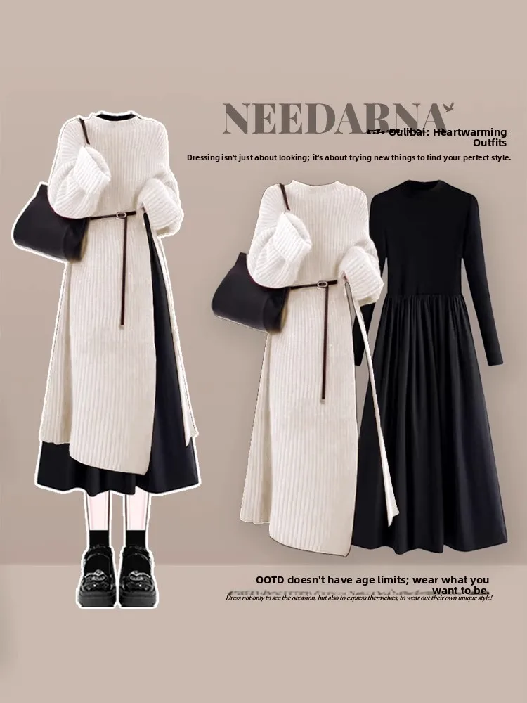 Autumn Winter Knitted Dr Set Women’s Slimming Waist Cinched Long Skirt Two-Piece Ensemble Ele French Sle Pure Color